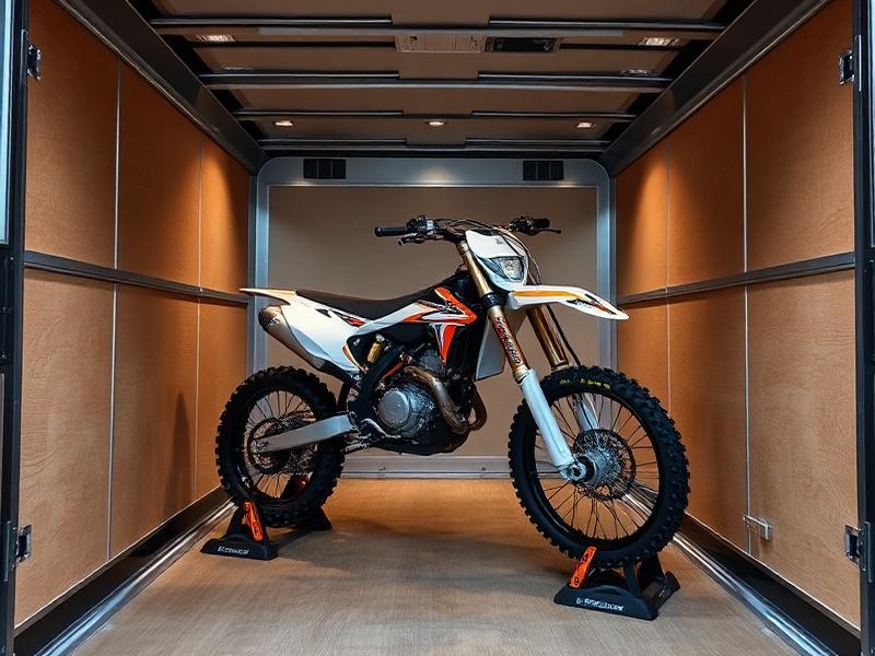 Your dirt bike is loaded carefully with soft-tie straps and wheel chocks, then transported in an enclosed trailer.